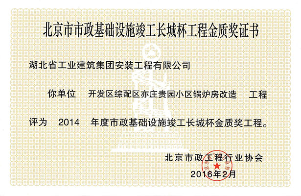 公司2014年度在北京市開發(fā)區(qū)綜配區(qū)亦莊貴園小區(qū)的鍋爐房改造工程,于2016年2月被北京市政工程行業(yè)協(xié)會授予北京市市政基礎(chǔ)設(shè)施竣工長城杯工程金質(zhì)獎。該獎的獲得代表了我公司在市政工程的施工中質(zhì)量有了質(zhì)的提高,并且得到了北京市政工程行業(yè)協(xié)會的認可。